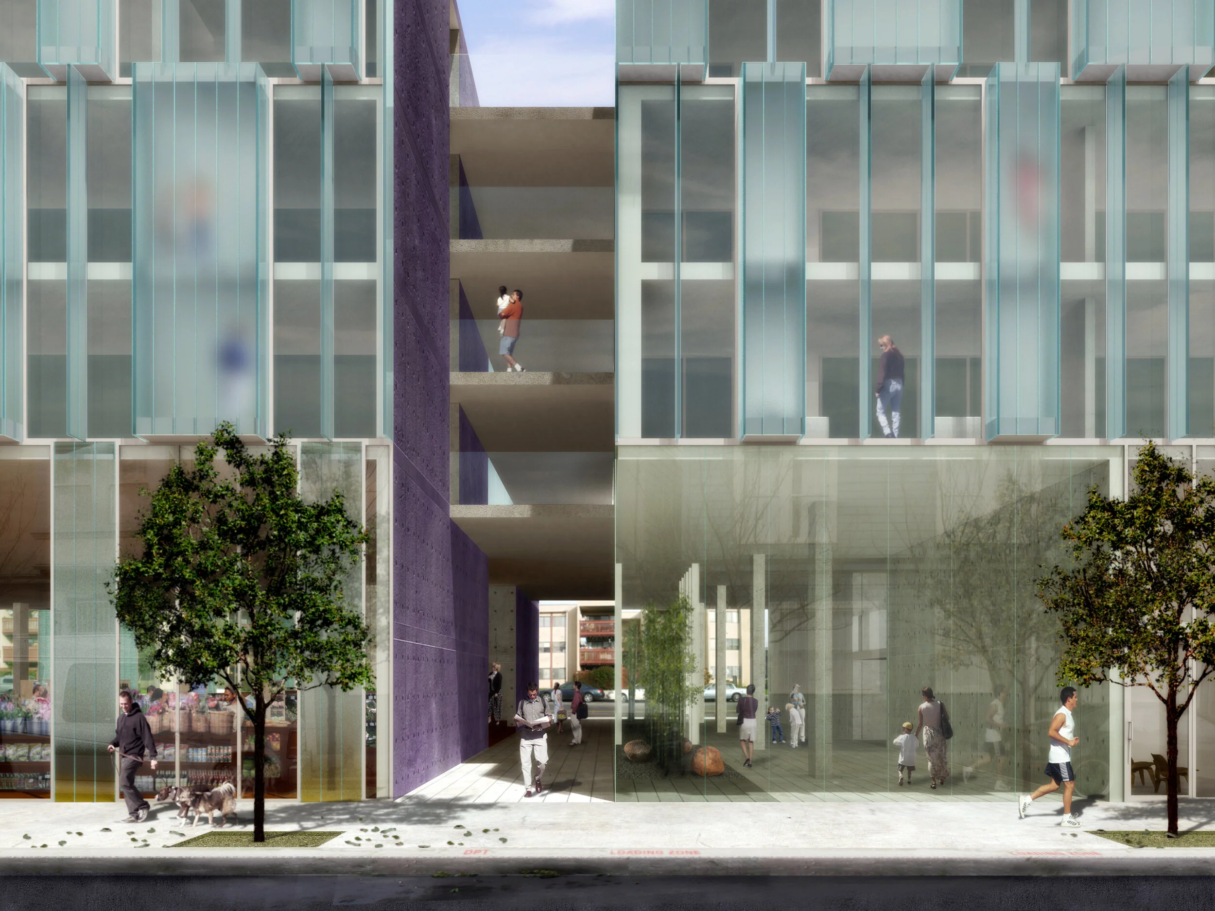 The ground floor of the building is a large grocery store, entered from a court off of Laguna Street. Folding doors open all around the street façade on Fulton and Birch to create the atmosphere of an outdoor market food hall.