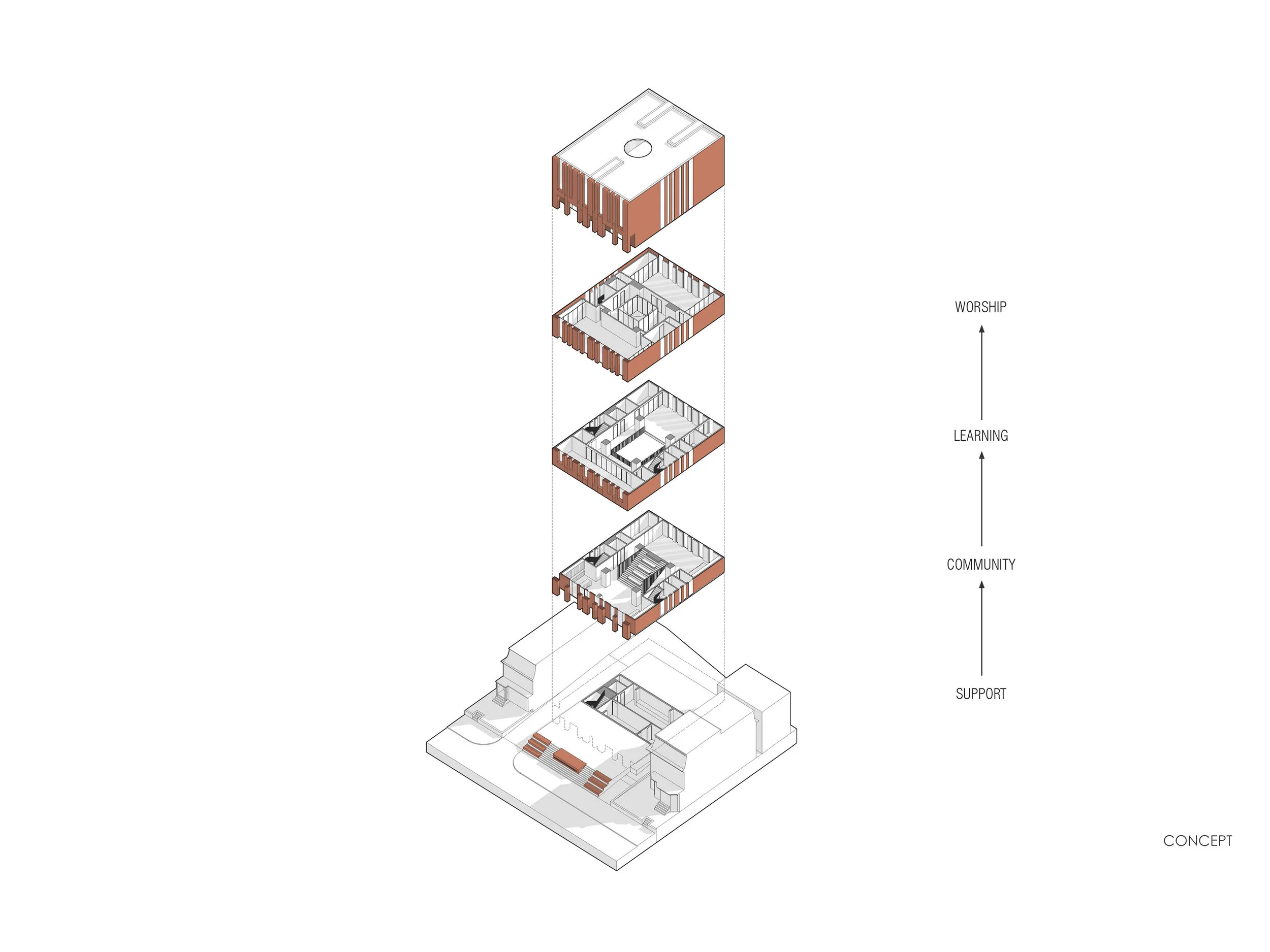 The top floor is the place of worship, the Shabbat floor, the level of sanctity. The three prayer gatherings, conservative, orthodox and reform, are connected with a central court that opens with a circular cut, an absent dome to the sky above. This is the only view in the city free of the works of man. This absent sanctuary is what is common and connects the three branches of worship in shared faith. The largest room doubles as the library, or Beit Midrash, the House of Learning. By day, light reflects on the woven brick notches, by night light shines from within. This is a space to create a continuing community of traditional values through meeting, learning, and ceremony. This is a place to gather and emanate light.