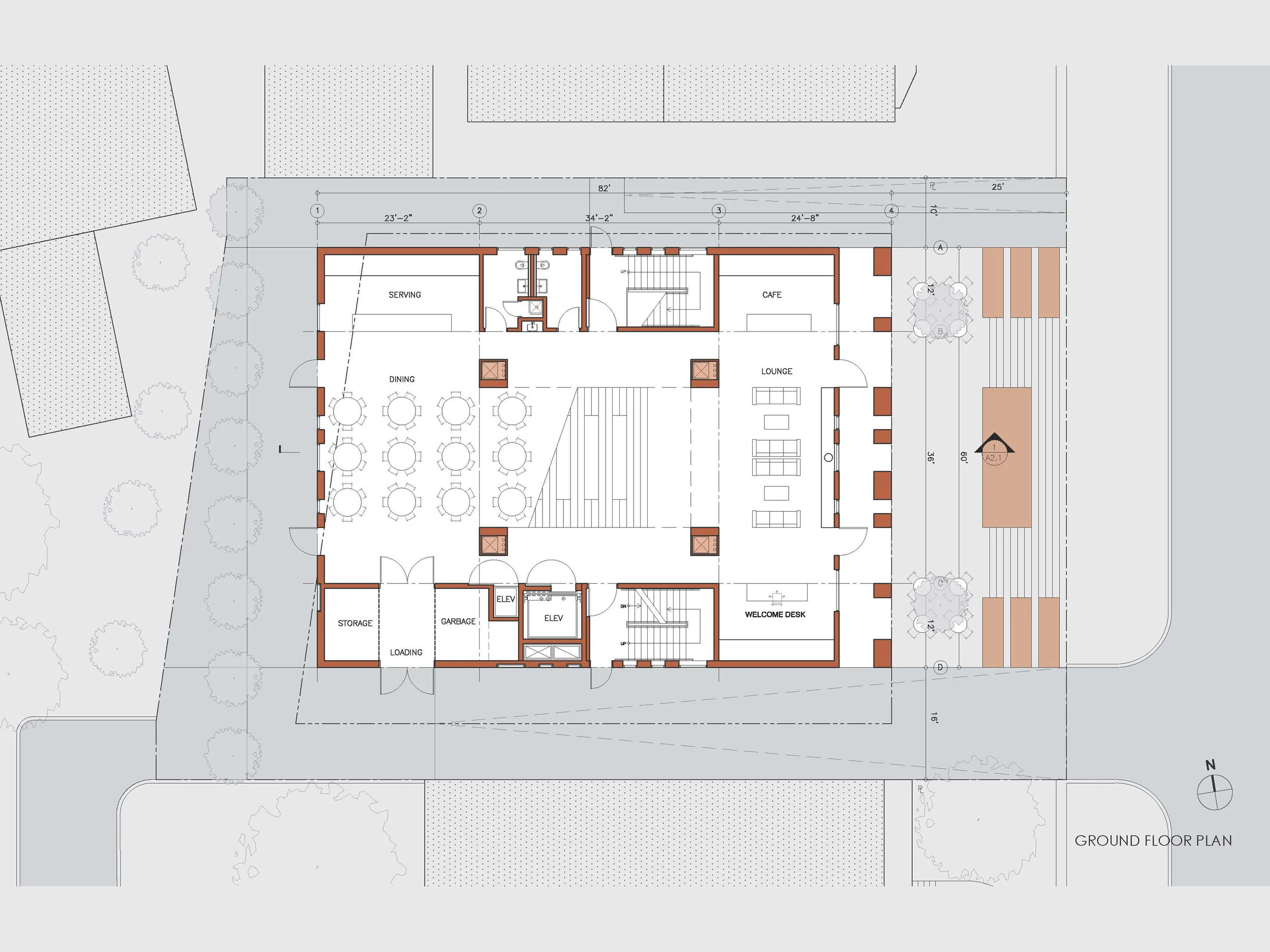 The street level is dedicated to everyday life, to meeting and talking, sitting around a fire, gathering and eating at the rear which opens to a garden. At the center, and connecting the second floor, is a stair, amphitheater, auditorium, with a balcony overlooking it from above. This multilevel courtyard is a multipurpose space at the heart of the building, the pivot of everything.